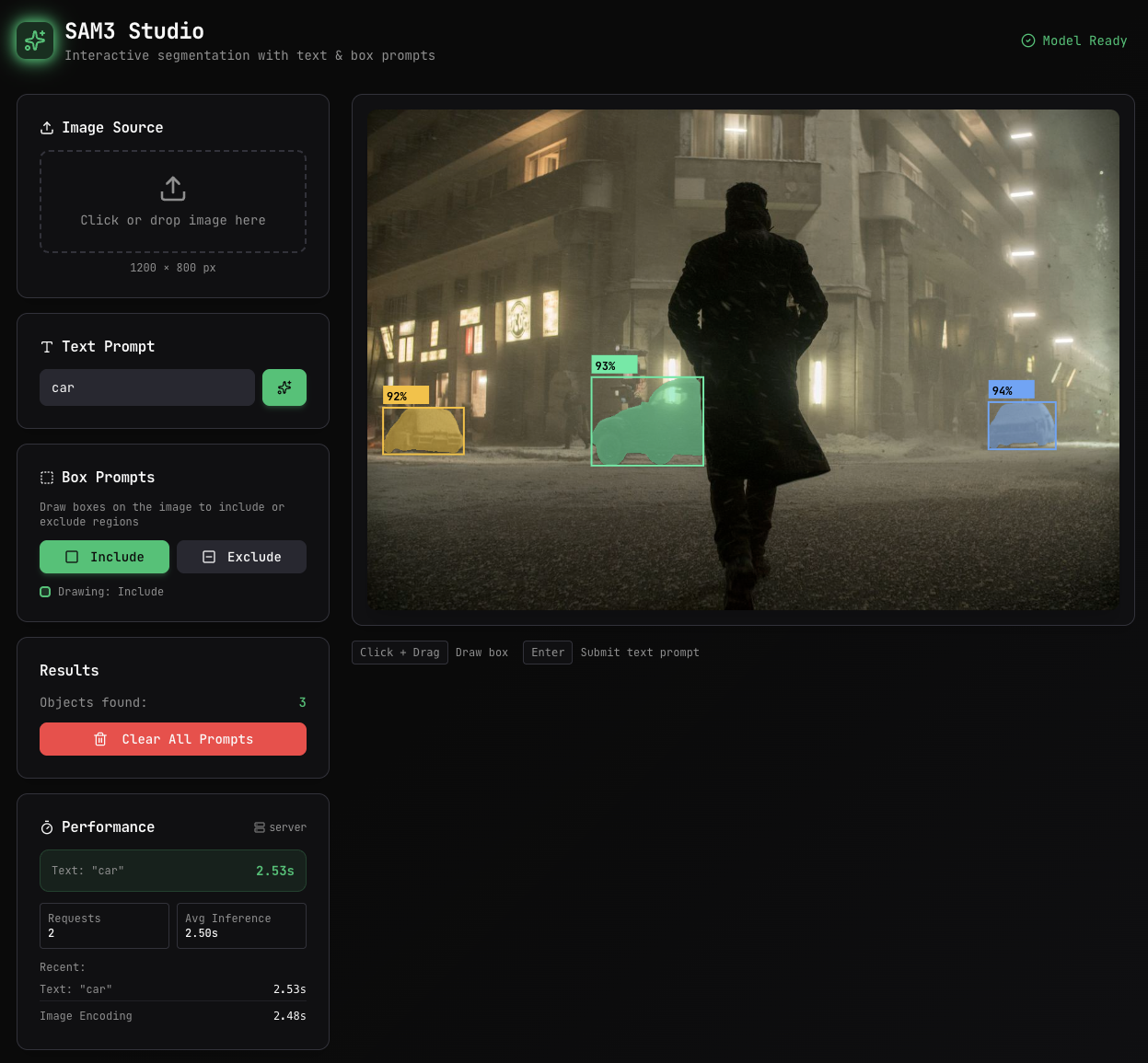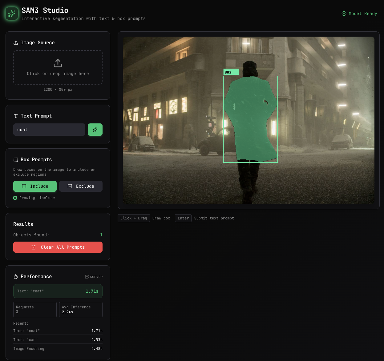 The main goal for me in building this is to see the inference speed of the model by actually using it as an application, so with the help of claude-opus-4.5 on cursor I built this in less than half a day which could’ve probably taken me 3 to 4 days to do some, but I for sure lost on some learning, but I told myself this is not the goal. But initially claude implemented a naive full mask on the backened to serialize and deserialize on the frontend and when I looked up on google, I came across the RLE method to encode and decode masks which is a lot more data efficient, the response was way quicker.