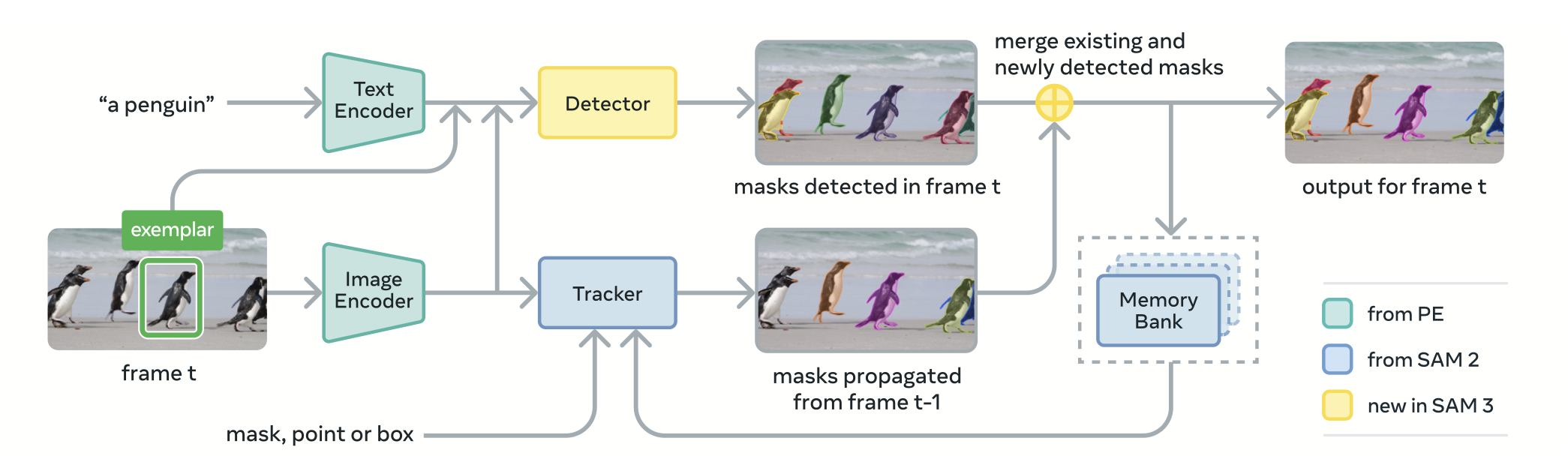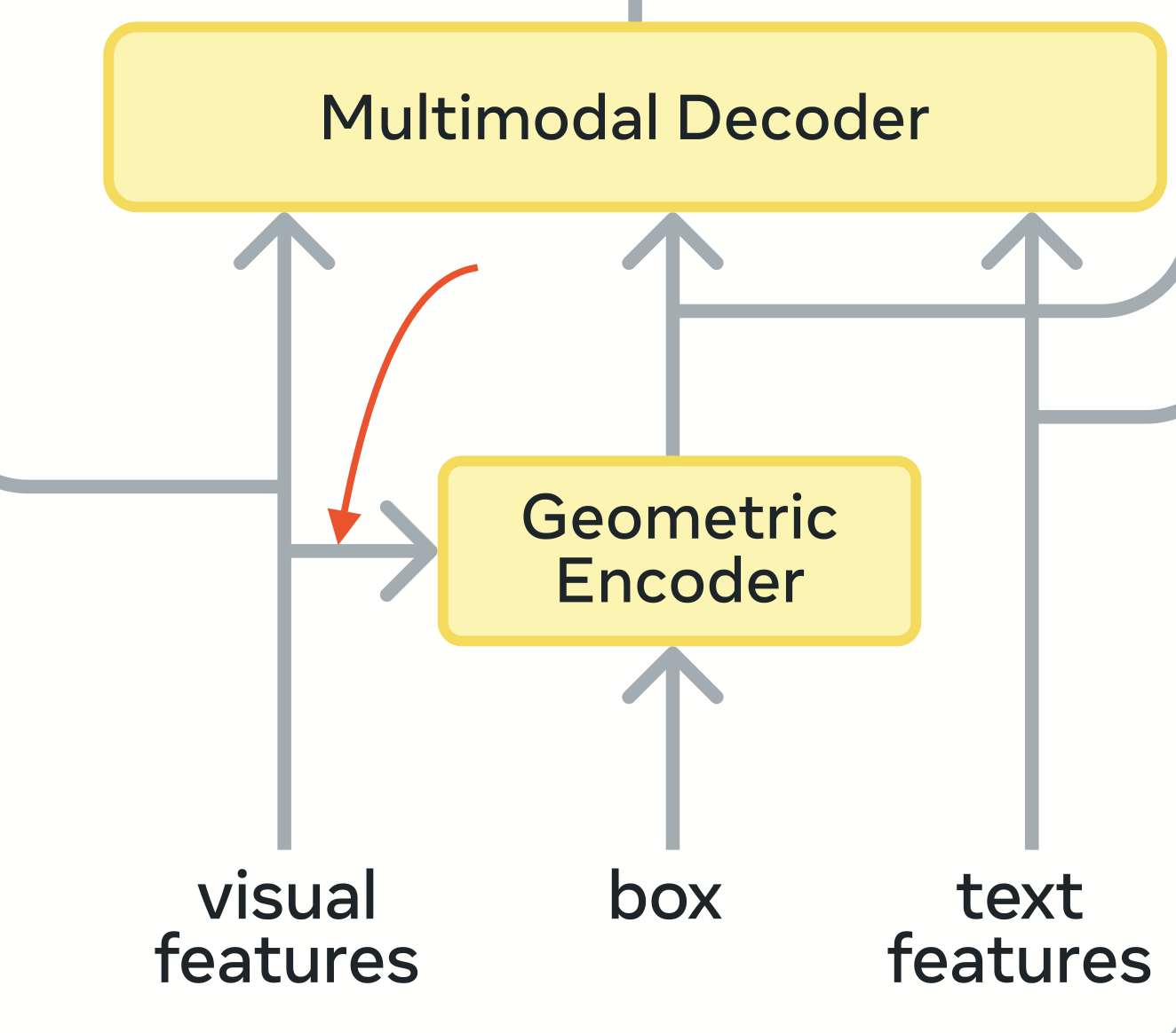 This component is used to encode points, boxes and masks for both Promptable Concept Segmentation (PCS), Promptable Visual Segmentation (PVS) tasks. Okay this is interesting, There are two tasks PCS and PVS, SAM2 was doing PVS and has the same Geometry Encoder component to encode points boxes and masks, but the difference, let’s say when using boxes, in SAM2 and SAM3 is that with SAM2 only the object within the selected box is segmented where as with SAM3 using a box now becomes an exemplar prompt which means the underlying concept within the box anywhere in the image is highlighted. For eg. If you drew a box on a dog in an image with 5 dogs, only that particular dog is segmented in SAM2 whereas all 5 dogs are segmented in SAM3